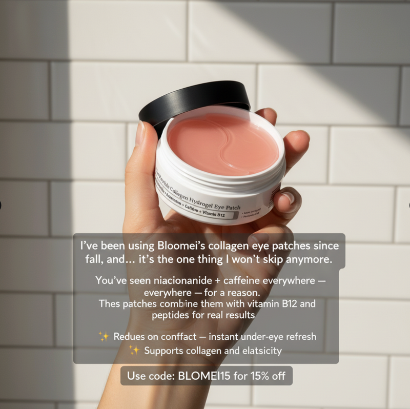 Bloomei's Collagen Peptide Patches are clinic-inspired hydrogel eye masks powered by collagen peptides +caffeine, adenosine & Niacinamide — the same ingredients trusted in Korean dermatology. Our unique stay-put hydrogel doesn’t slide around; it locks these actives against your skin so they absorb deeply instead of evaporating like creams.